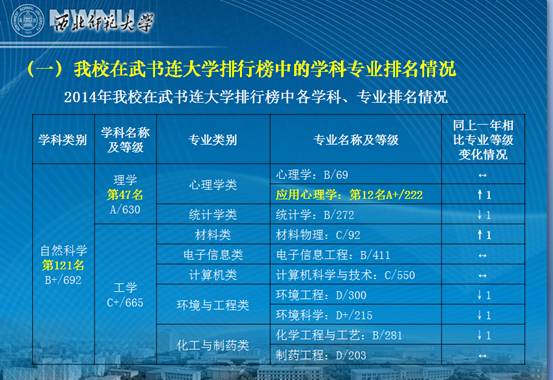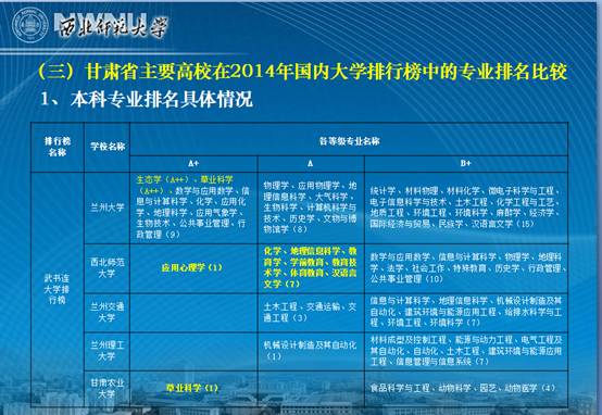 据西北师范大学发展规划处报道,中国管理科学研究院武书连大学排行榜学科专业排名最新情况公布。2014年我校共有52个本科专业参与排名,新利体育“应用心理学”专业在在全国开设心理学类专业的222所本科院校中名列第12位,等级被评定为A+。与2013年相比,专业评级等级排名上升一位。该排名也是我校在甘肃省主要高校武书连大学排行榜学科专业排名中唯一进入A+等级的本科专业。武书连大学排行榜学科专业排名以人才培养和科学研究为主要评价指标,等级评价采用百分比法,用A、B、C、D、E共5等11级表示各专业的实力。A++(前2%)、A+(2%~5%)、A(5%~10%); B+(10%~20%)、B(20%~30%);C+( 30%~40%)、C(40%~50%);D+(50%~60%)、D(60%~70%);E+(70%~85%)、E(85%~100%)。