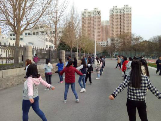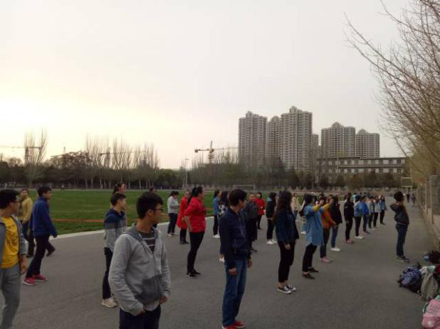当天下午第5.6节课,大一二班的同学们在集合东操场开始学习体操。看,她们来了。