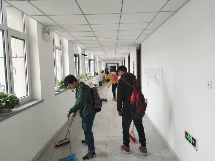 全体成员进行了工作分配,每位成员都明确了自己的清扫任务。对特教楼的墙壁、门窗和玻璃等进行了清理,并对地面以及门后死角等进行了清扫。
