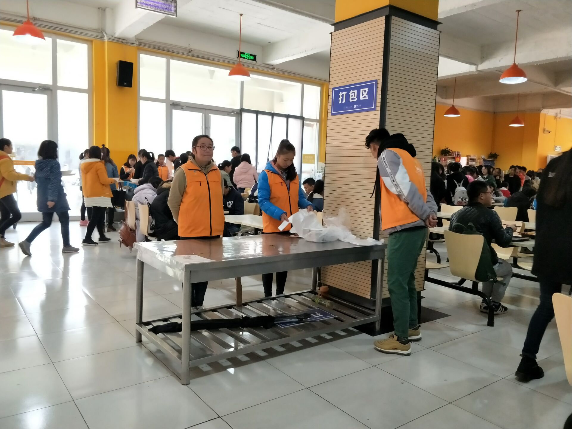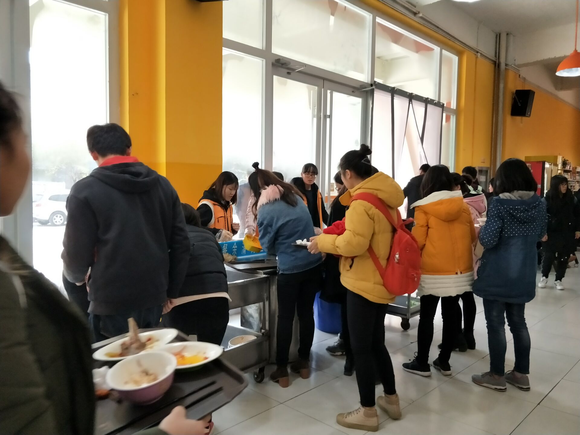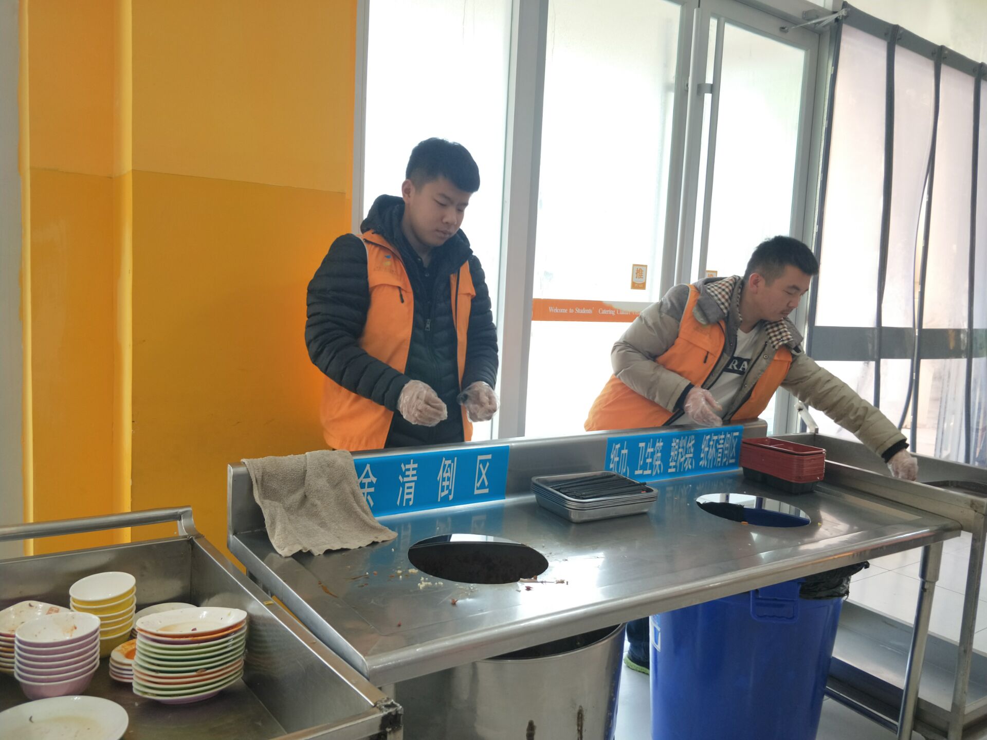 督导期间,我院学生按时到岗,全身心投入到工作中,指引就餐结束的同学将剩菜倒入桶中,将餐具放到指定位置,并动手帮助食堂阿姨将餐具分类回收。