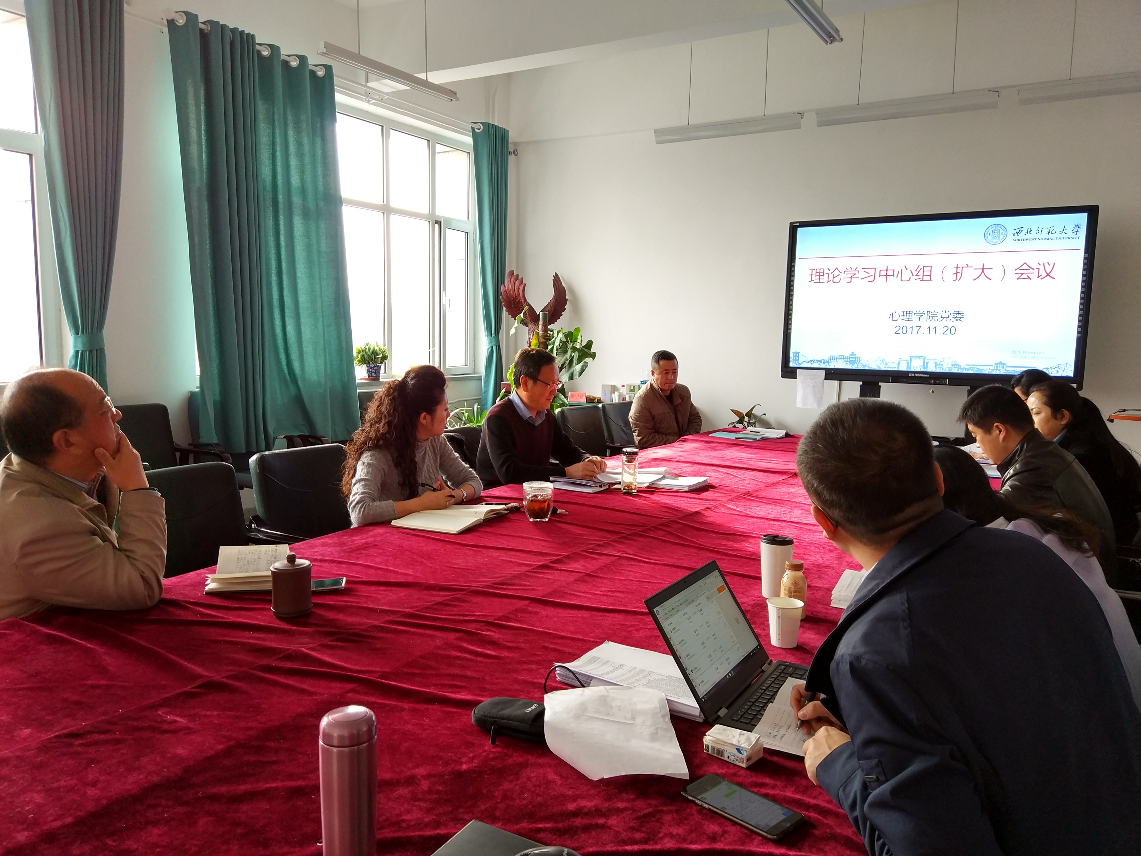 2017年11月20日下午,新利体育党委召开理论学习中心组(扩大)会议,专题学习党的十九大精神,研究部署学院十九大学习宣传工作。学院领导班子、党委委员、党支部书记、系主任出席了会议。会议由党委书记刘慧阳同志主持。