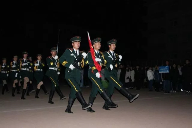 6点半,所有参与人员准备就位。现场随着国旗护卫队的出现而安静下来,在全体同学的注目下,英姿飒爽的国旗护卫队队员们护送鲜艳的五星红旗进场,行礼完毕,伴随着庄严的《中 华人民共和国国歌》 ,五星红旗冉冉升起,迎风飘扬。在场的每一个人深怀着对祖国无限的热爱和崇高的敬意向国旗行注目礼。