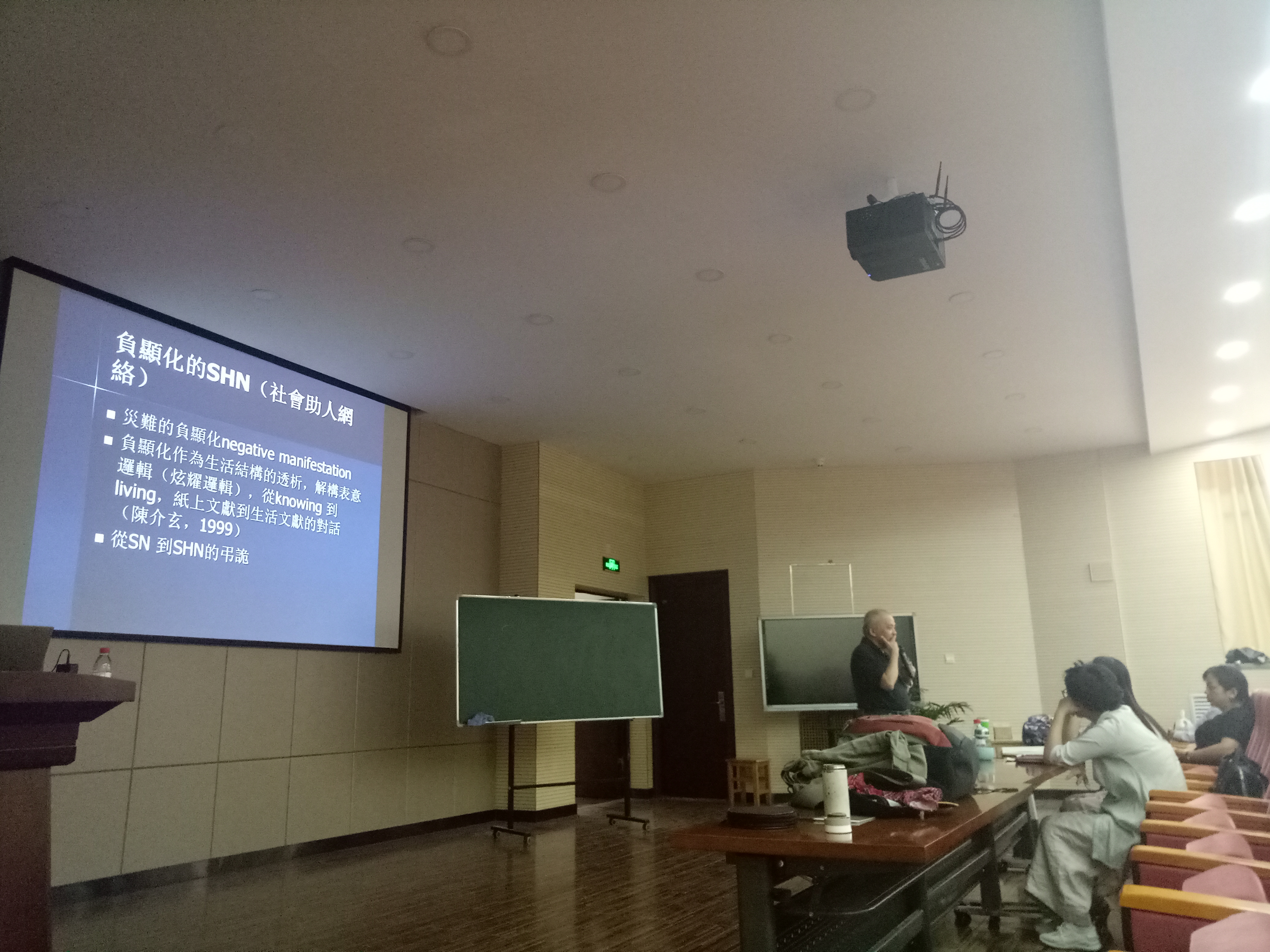 在报告中,余安邦老师先通过陈秉华先生主编的《多元文化咨商在台湾》带领大家展开热烈的讨论,从乔健教授讲的香港人的认知游戏到文化产业的营造运动学习文化咨询的源头,再回顾1995年对文化咨询的构想和2002年的文化咨询,大家一同探讨临床人类学的可能性。接着,余安邦老师讲到“一个要做文化咨询的人,其本身必须是知识的生产者”,带我们纵观文化咨询的知识生产,学习“负显化的社会助人网络”、“形式逻辑的操演”、“人文社会科学的技艺”等相关知识。期间,余安邦老师为大家播放记录片《人文临床与辽愈活动记录》,让在场者体验台湾文化咨询先行者们开展的迷你讲座、研讨会和工作坊等活动过程。之后,余安邦老师以宠物治疗为例解释文化咨询“从功能性转入存有性”的思考,继而阐释“如何力行人和动物的和谐关系”“单亲小孩的故事”“只要能生活下去的态度”启发在场学习者如何深入人文咨询与临床的现场。最后,余安邦老师一一列出盛正德老师的以画疗伤、台湾作家的辽愈书写、智德法师的摆渡人间世情苦、何骐竹的阅读辽愈以及塔罗牌写作和朗诵分享等实例带大家体会文化咨询的多元与实践。