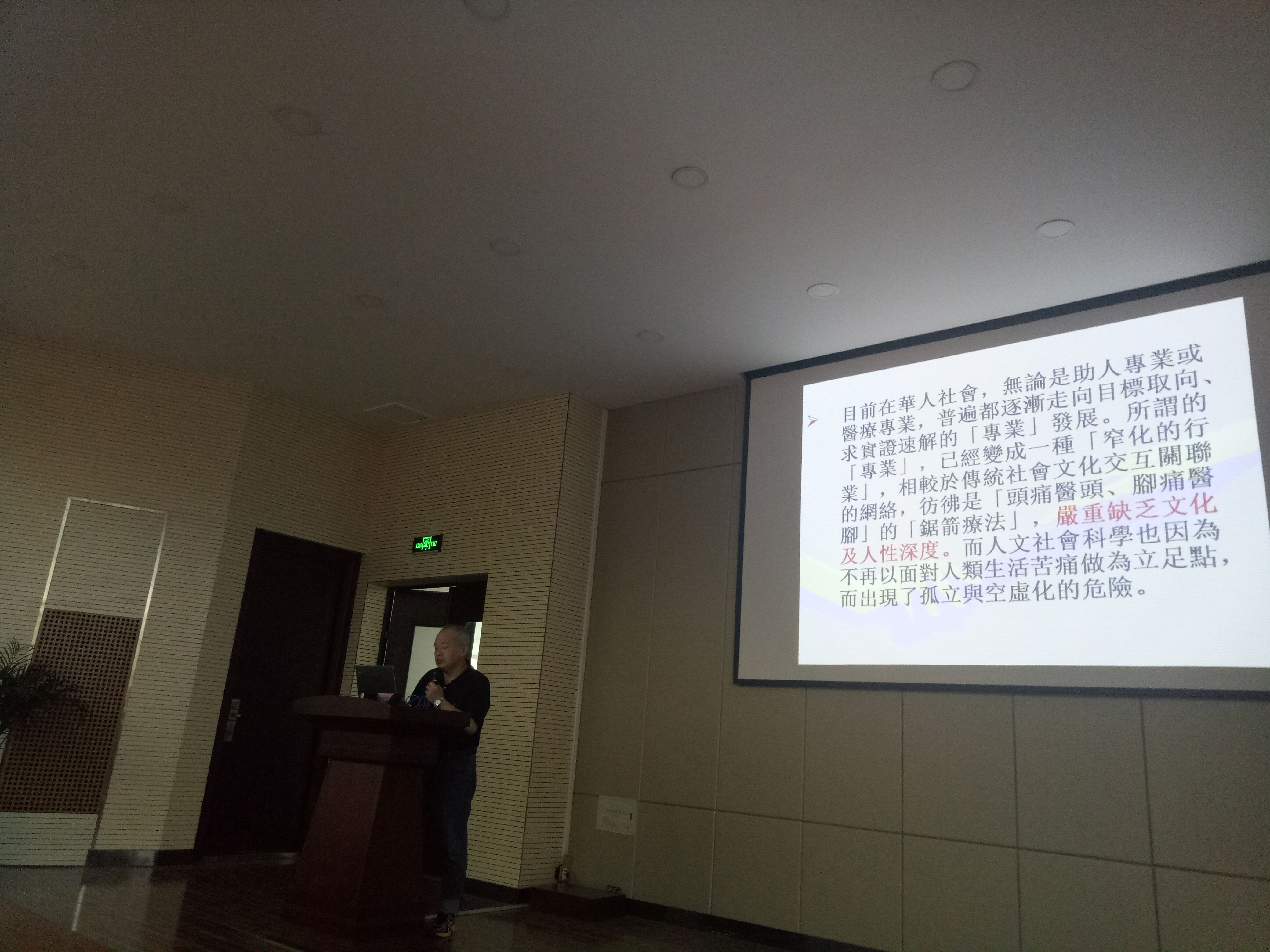 在报告中,余安邦老师就文化与心理病理的发展趋势从文化概念、文化态度和个人经验过程三个相互关涉的层面带我们探讨文化心理病理与治疗的研究焦点。首先,余安邦老师总结前两年研究计划的主要切入点:探寻契合性的本土心理辽愈之形貌;在本土华人特殊的社会文化脉络下,从受苦经验的觉知、诠释、感应到反应的历程中,华人社会文化特性与心理症状或治疗的关系。接着,余安邦老师指出本土临床心理研究的实践即是集体他助与个人自助的平衡。之后,余安邦老师详细阐述了负显化的概念,即个体的社会人际处境发生断裂、崩盘、失所或失位,而造成个人进行其受苦的过程。同时,余老师通过实例一一分析了运作世界、习而不察的生活域、无法言说的真实域和心性基底的身四个负显化的层面。最后,余安邦老师讲到任何人文学科如果细看其创造的来源,与他者的会遇是个非常根本的经验质地。