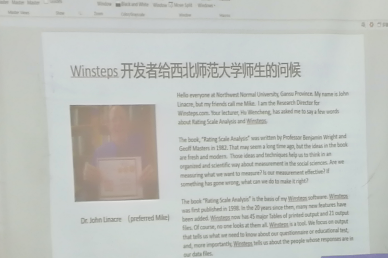 现行的各类考试中,如何透过一道题目更为真实的体现测试者的能力和水平,成为大家关注的核心问题。胡老师以此切入今天的报告中心,回顾了IRT及Rasch Model的相关理论,通过软件现场展示了Winsteps的使用流程,并针对不同的研究主题,对部分统计图表做出详尽的解读。在场师生与胡老师同步进行操作,切实感受到了Winsteps软件在数据分析中的特点和优势。