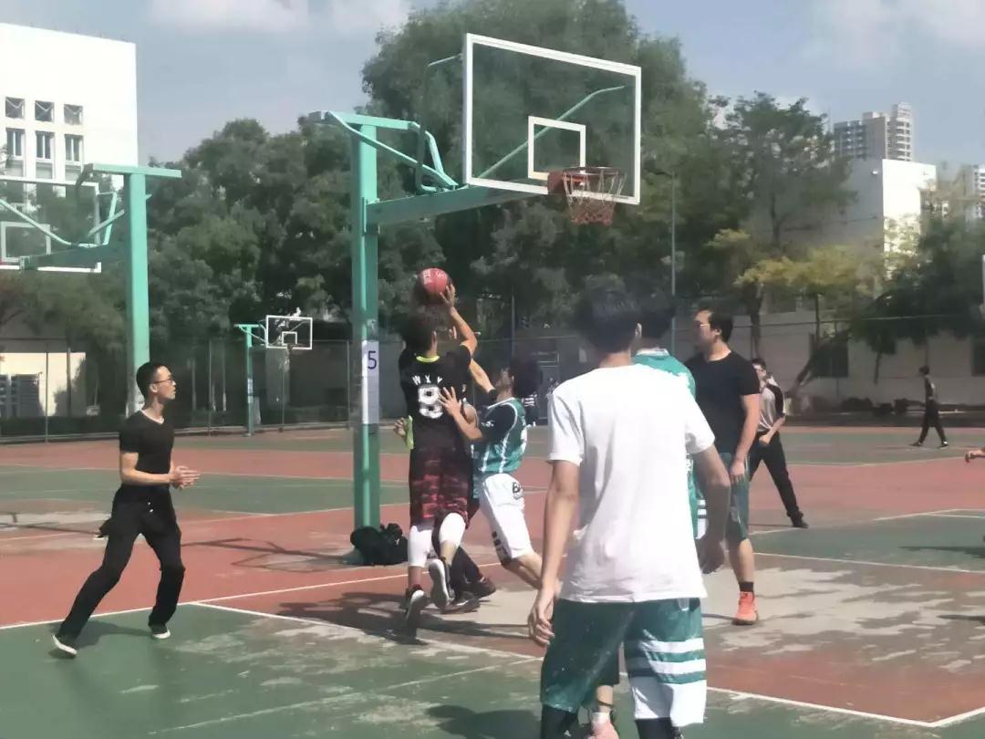 临近中午1点,在西篮球场5号场地,一场激烈的球赛即将打响。身穿黑色球衣的是来自新利体育2017级和2018级的男生代表队,另一边身穿绿色球衣的是新利体育2016级男生代表队。