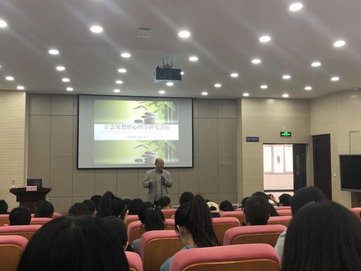 报告会上,肖教授就如今正念冥想的发展历程、如今的研究进展及应用做了详细介绍。正念就是有目的的、有意识的,关注、觉察当下的一切,而对当下的一切又都不作任何判断、任何分析、任何反应,只是单纯地觉察它、注意它,不加以任何评价和抗拒,从而全身心的关注自身当下的体验。正念是对大脑的注意力很好的训练,掌握好正念方法,会使人整个的专注力、思考力的程度得到很大的提升。肖教授也说到,正念不仅仅是对感知、自我调节、认知、情绪等心理机制有巨大影响,而且通过脑电等研究方法也表明,正念对大脑结构以及大脑半球的平衡也有广泛影响,经过十一个小时的正念训练,我们的大脑结构就会有所变化。