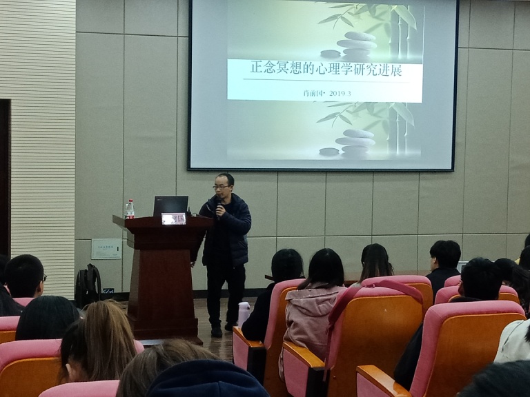 2019年3月22日下午,应学院邀请重庆文理学院心理健康与教育方向学术带头人肖前国教授在特教大楼1号报告厅为我院师生开展了主题为“正念冥想的研究进展”的讲座,肖教授主要从事正念、自我、心理健康等领域的研究,在上海精神卫生中心、北京、广州等地接受过正念认知行为疗法(MBCT)资格培训、正念减压疗法(MBSR)(网络课程)、五日止语禅、接纳承诺疗法(ACT)、英国“静观进校园”项目首席教师培训师等项目的培训。报告由新利体育周爱保院长主持,新利体育150余名师生参加了此次讲座。