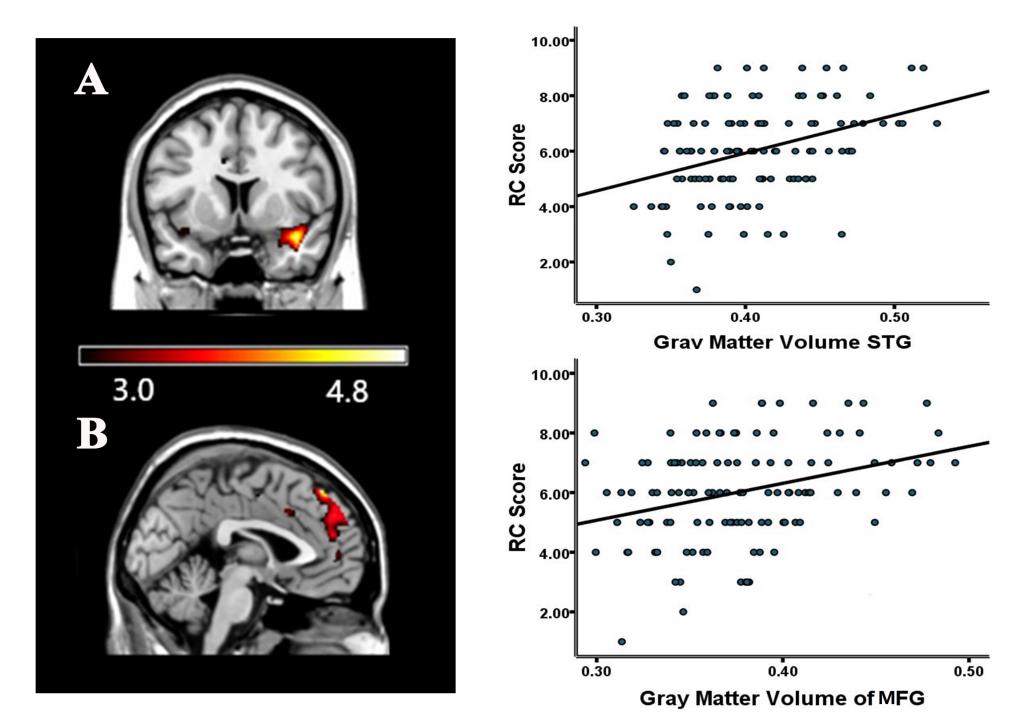 Figure 2. Regional gray matter volume correlated with representation connection (RC). The right Superior Temporal Gyrus (STG) and the left Medial Frontal