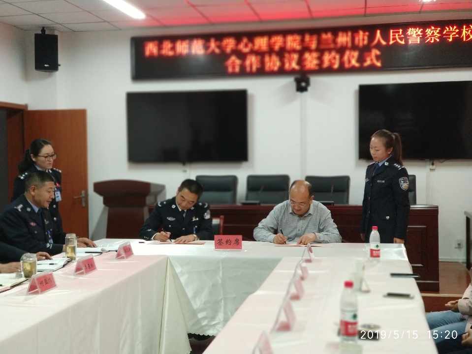 2019年5月15日下午,新利体育与兰州市人民警察学校合作协议签约挂牌仪式在兰州市警察学校举行。兰州市公安局党委委员,政治部负责人郑坤、副主任赵振国,市警校校长何亚鸣、副校长冯广仁,政委李春林,西北师范大学新利体育院长周爱保,副院长赵鑫及部分教师代表出席本次揭牌仪式。