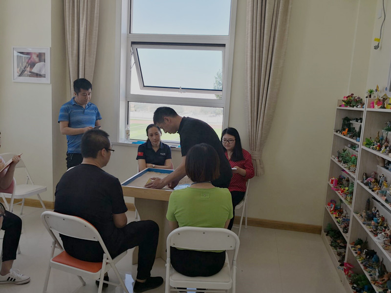在沙盘体验后,大家都被沙盘游戏治疗的魅力所吸引,于是6月15日晚在西北师范大学特教楼沙盘室又进行了一次沙盘体验。