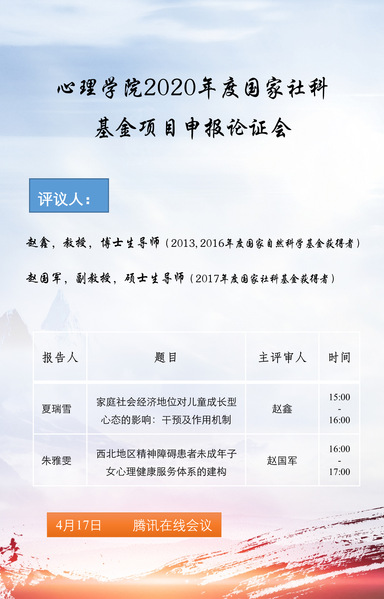 2020年4月17日下午,我院举行2020年度国家社科基金申报线上论证会。此次论证会邀请了赵鑫教授和赵国军副教授作为主要评议人,对我院拟申报2020年度国家社科基金项目的申报书进行指导。论证会上,我院夏瑞雪老师和朱雅雯老师就此次申报项目的选题的背景、研究意义、研究内容、主要目标以及思路方法等方面逐一进行了汇报,主要评议人及参会的老师对项目申报书中存在的问题进行了分析,并提出了修改意见。线上申报会由我院科研秘书李世峰博士主持,我院13位教师参加了此次线上论证会。