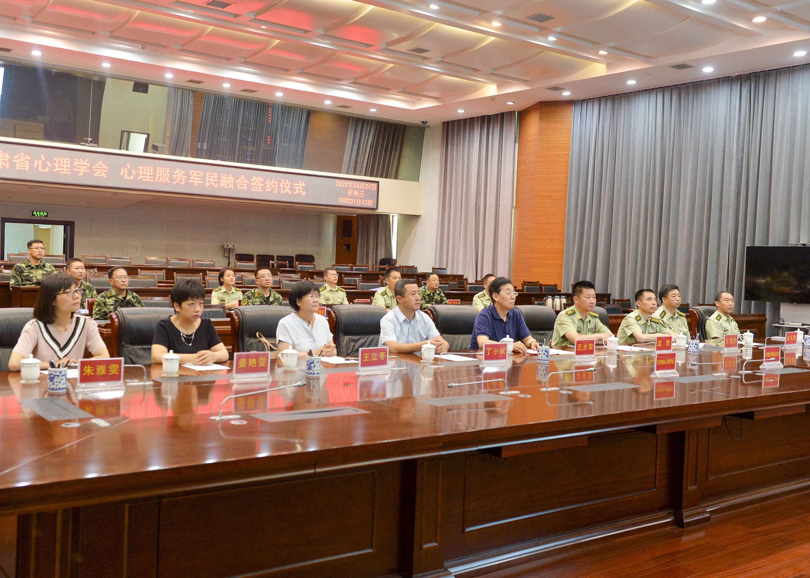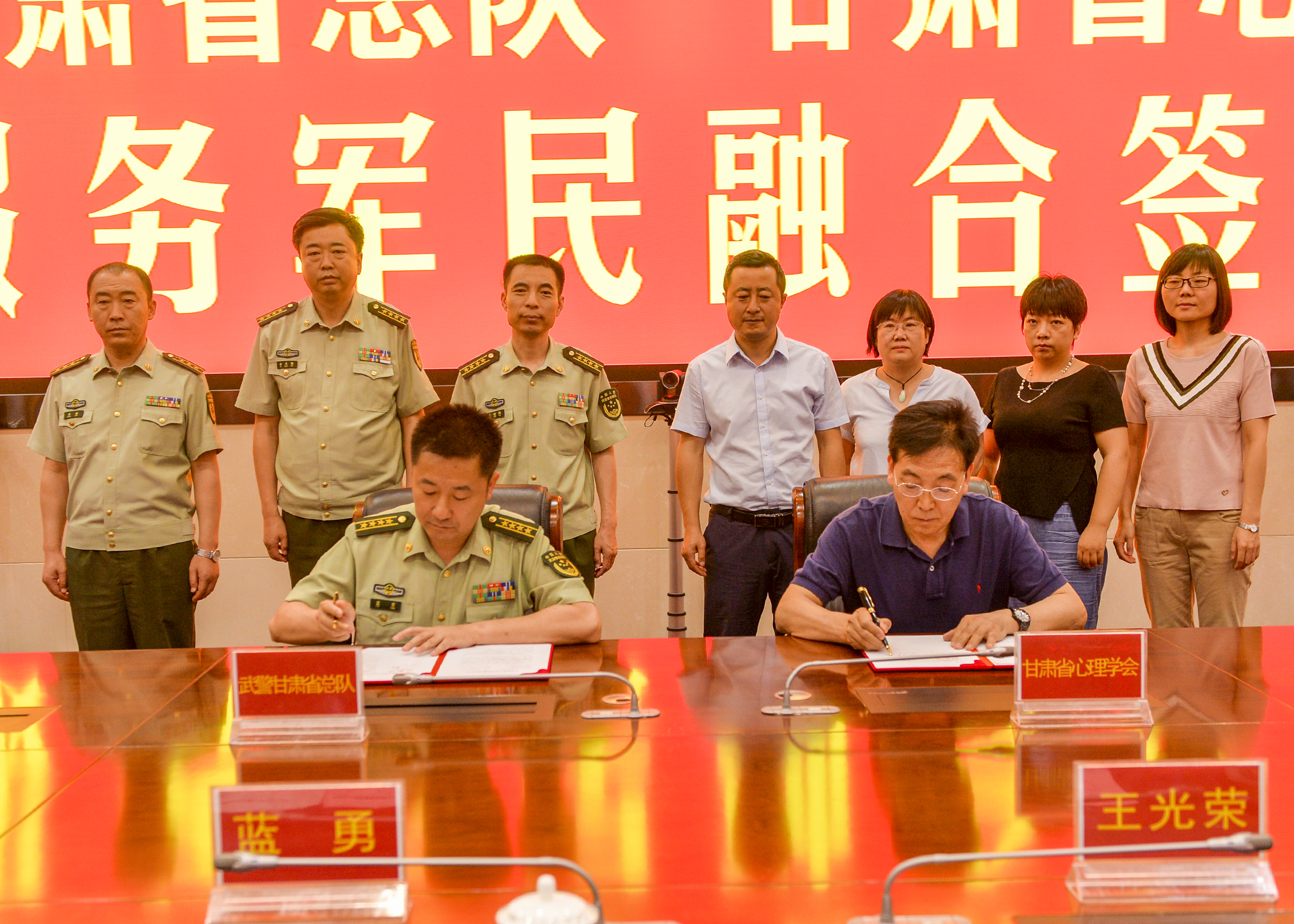 为践行心理学专业服务社会的使命,有力推进心理服务军民融合工作,6月24日上午,武警甘肃省总队与甘肃省心理学会和新利体育在总队机关举行心理服务军民融合签约仪式。仪式由总队政治工作部王建勋主任主持,总队蓝勇副政委和省心理学会王光荣秘书长,分别代表总队和省心理学会致辞并签署协议。新利体育丁小斌副院长、姜艳斐、朱雅雯老师、省心理学会常务理事王立冬和总队心理工作领导小组成员参加签约仪式。