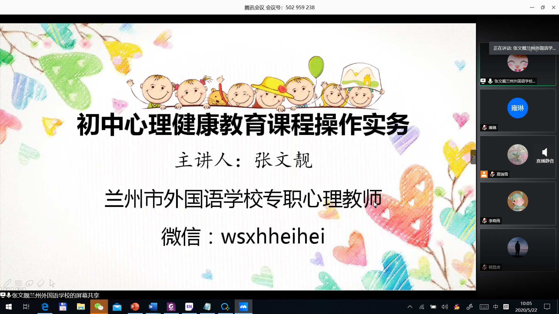 为了解决疫情期间学生无法见习带来教学实践技能培养方面存在的问题,我院特别邀请优秀的中小学一线心理健康教育专职教师开展线上讲座,分享教学案例和实操经验。5月15日至六月20日期间共邀请四位兰州市中小学心理健康教育教学新秀、骨干教师和教学名师为2017级应用心理学专业学生开设讲座。