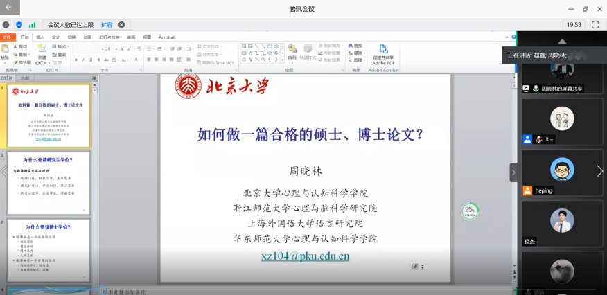 2020年7月9日,应学院邀请,北京大学心理与认知科学学院周晓林老师在线为我院师生作题为《怎么做一篇合格的硕士、博士学位论文?》的学术报告。报告由学院院长赵鑫教授主持,300余名师生在线收听了报告。