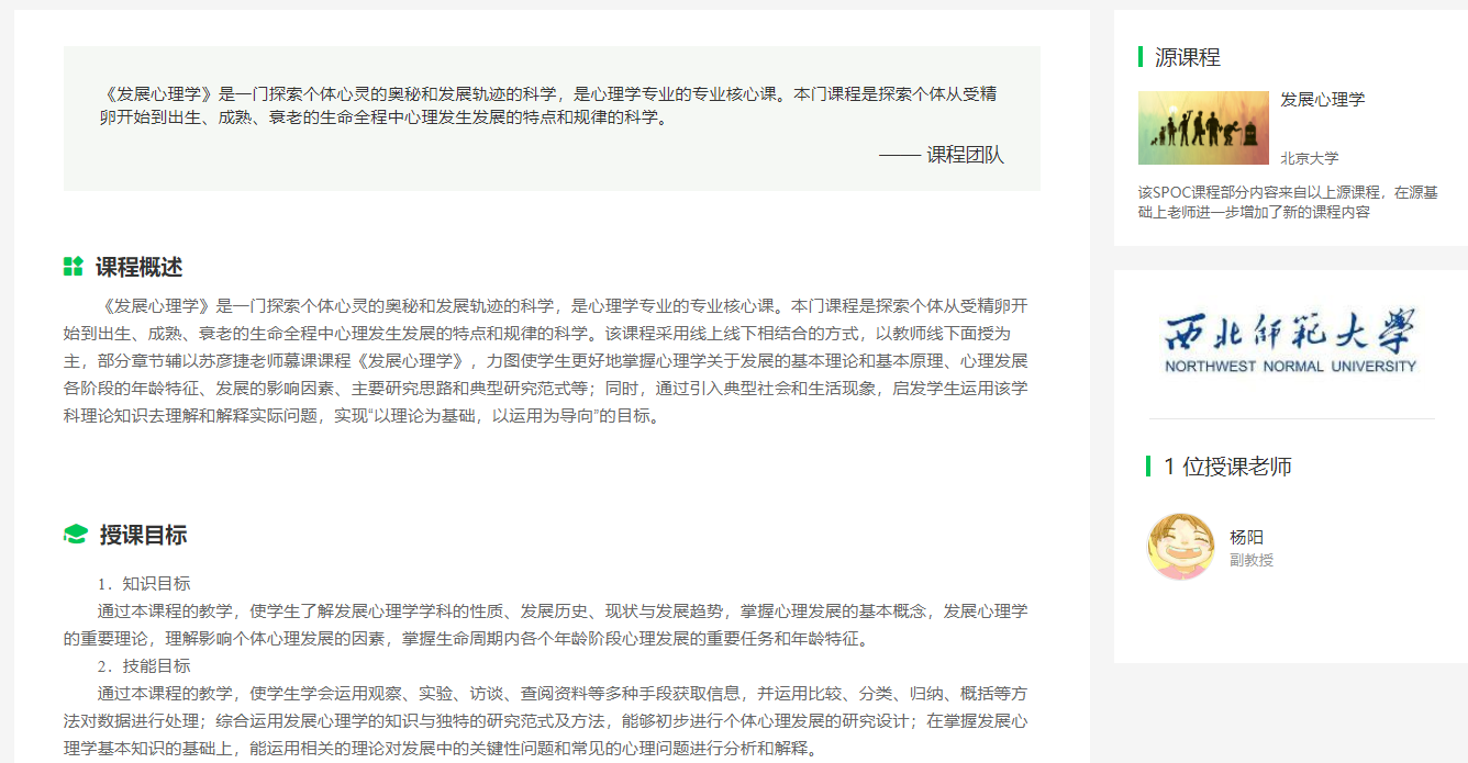 在学校的支持下,新利体育于2020年组织《发展心理学》线上线下混合式 “金课”建设。该课程由学院杨阳副教授主持,引入了中国大学慕课平台的《发展心理学》线上课程资源。该课程线上资源是由北京大学苏彦捷教授组织建设,课程资源丰富,内容活泼生动,得到了众多好评。