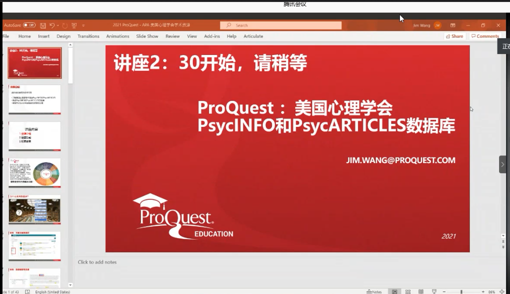 2021年3月8日下午,应新利体育邀请,ProQuest资深培训及咨询顾问王剑飞老师为学院全体师生做题为《ProQuest助力学习研究,全面掌握美国心理学会学术资源》的线上讲座,新利体育200余名师生参加了此次讲座。