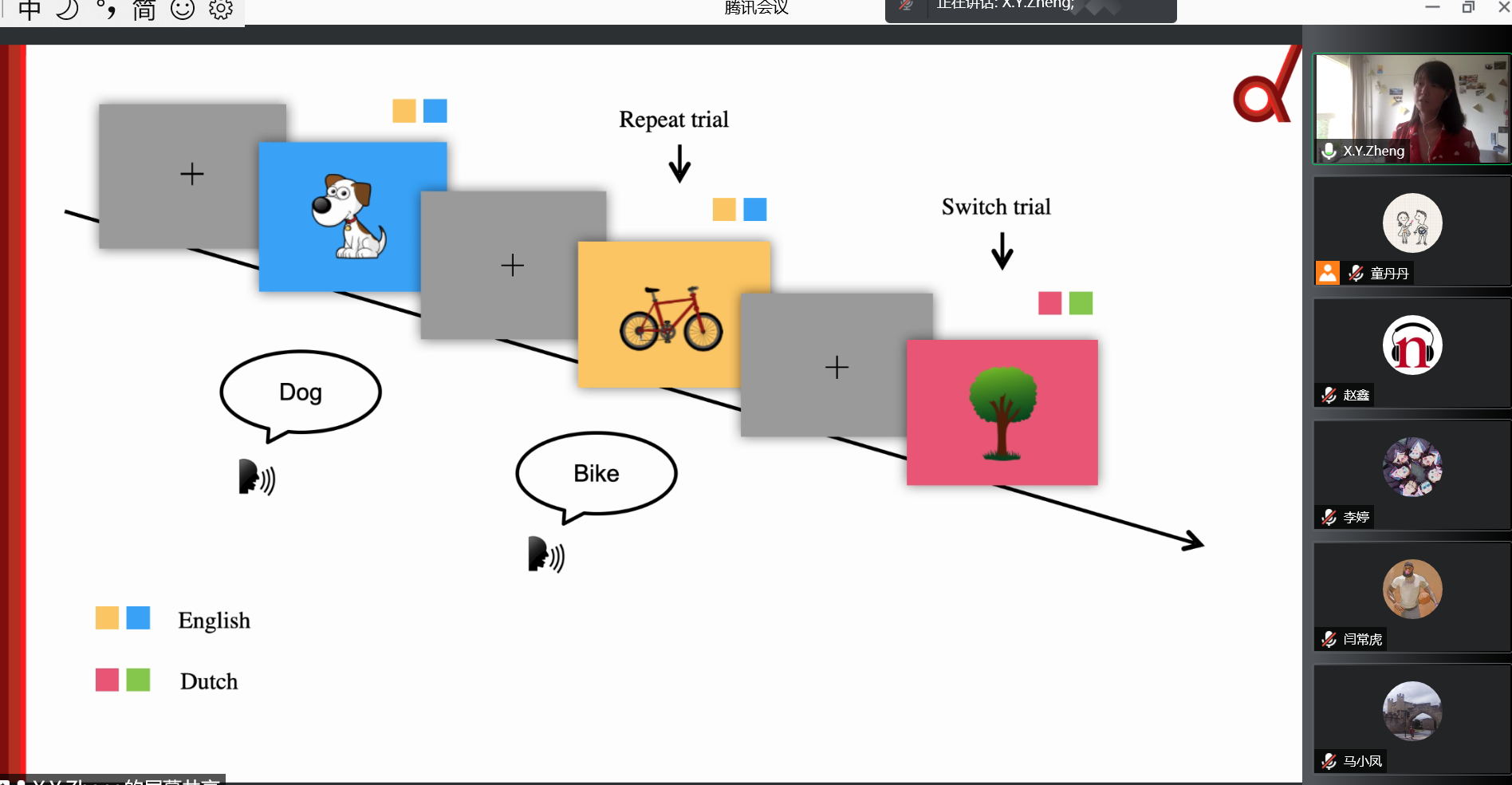 郑晓辰博士首先对自己的研究经历和方向进行了简单的介绍并引出本次讲座的主题:认知控制在语言生成中的脑机制。而后,郑老师分别从认知控制的概念和测量方式、认知神经科学的常用研究技术、双语转换中抑制控制的影响机制、语言产生中认知控制对不同年龄个体的影响机制、研究启示及未来展望等方面详细进行了报告。