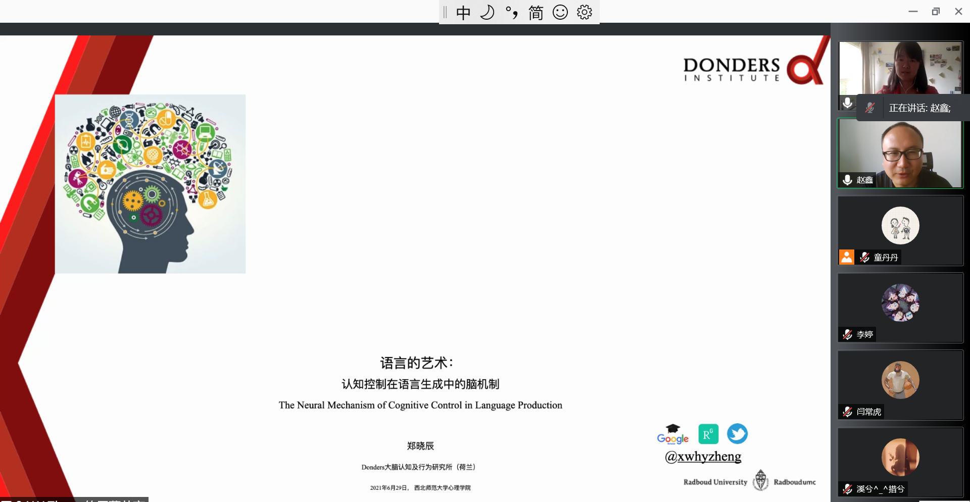 2021年6月29日,应新利体育邀请,荷兰Donders大脑认知及行为研究所博士后研究员郑晓辰博士为我校师生作题为《语言的艺术:认知控制在语言产出中的脑机制》的学术报告。报告由新利体育院长赵鑫教授主持,新利体育100余名师生参加了本次报告。