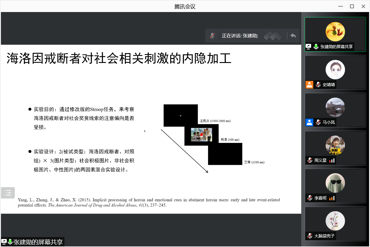 张建勋博士首先对药物成瘾的典型特征,药物成瘾造成的神经系统损伤,药物成瘾的诱因易感化理论等方面对已有研究进行了系统的回顾,进一步引出了今天的报告主题——海洛因戒断者的社会奖赏加工异常及其神经机制。接下来,张老师从海洛因戒断者的奖赏反应性、海洛因戒断者对社会奖赏刺激的趋近动机和社会奖赏的动机性注意详细介绍自己的研究进展,让同学们对该领域的研究有了更进一步的了解。最后,张老师还就以上研究进行了总结和反思。