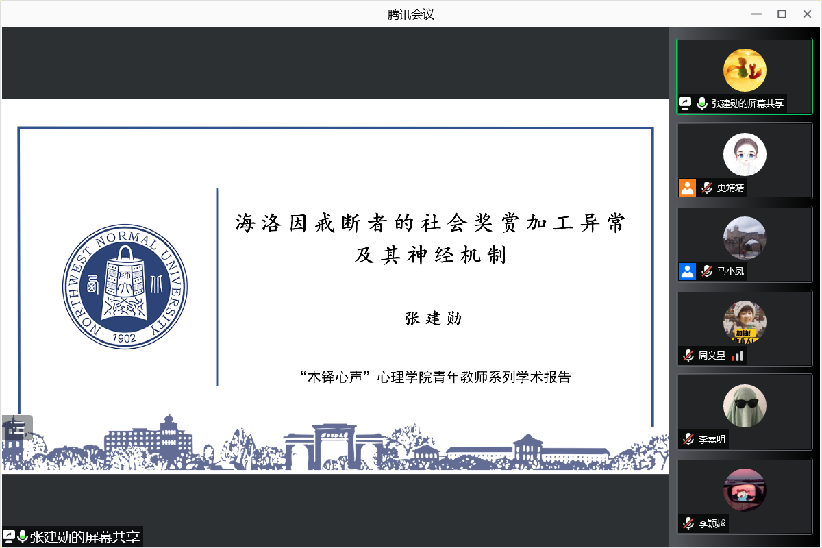 2021年11月5日,新利体育举办了第二场“木铎心声”新利体育青年教师系列学术讲座,张建勋博士为我院师生作题为《海洛因戒断者的社会奖赏加工异常及其神经机制》的学术报告。报告由新利体育马小凤教授主持,新利体育一百余名师生参加了本次报告。