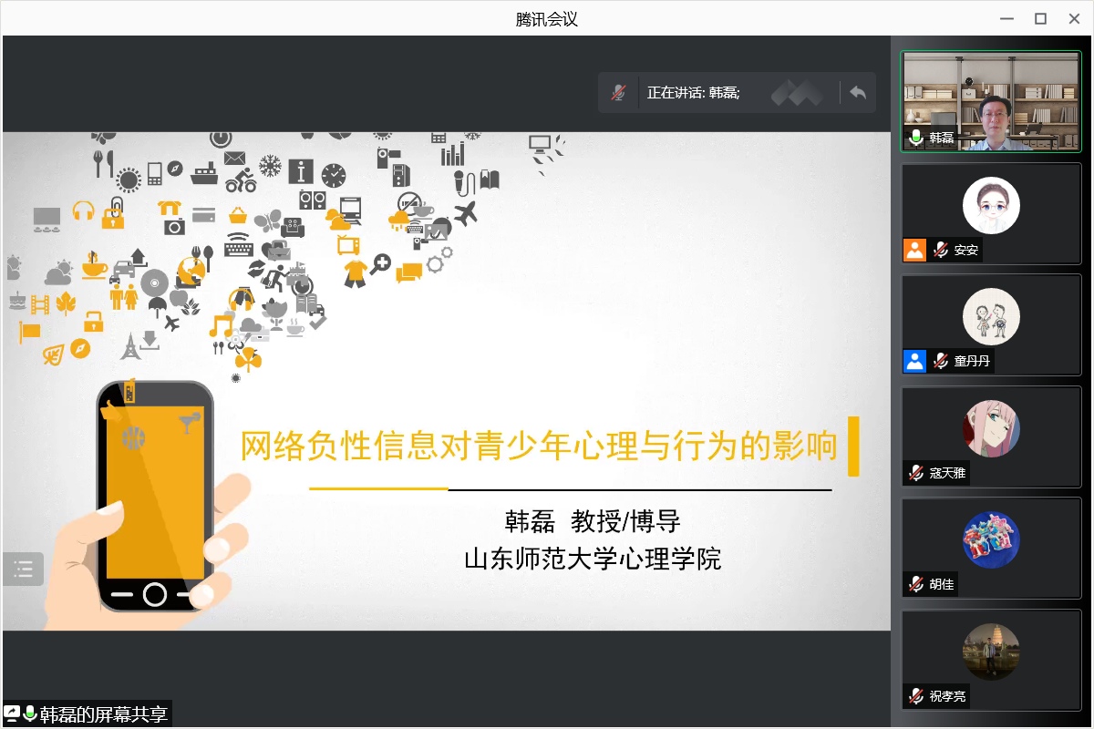 2021年11月12日,应新利体育邀请,山东师范大学新利体育韩磊教授为我校师生作题为《网络负性信息对青少年心理与行为的影响》的学术报告。报告由新利体育童丹丹副教授主持,新利体育一百五十余名师生参加了本次报告。