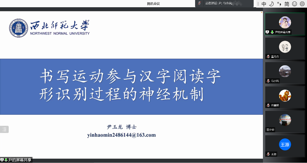 尹老师首先从字形识别过程的视觉分析解码系统、书写运动影响阅读字形识别过程、书写影响阅读字形识别过程的其他因素三个方面对书写运动参与阅读字形识别过程的研究现状进行了综述。而后,尹老师分别对书写运动能否影响熟练阅读者阅读时的深度正字法加工阶段、书写运动影响阅读字形识别过程的机制这两项研究进行系统的介绍,并在报告中着重分享了实验范式和研究方法,让同学们对该领域的研究进展和实验方法有了较为充分的了解。