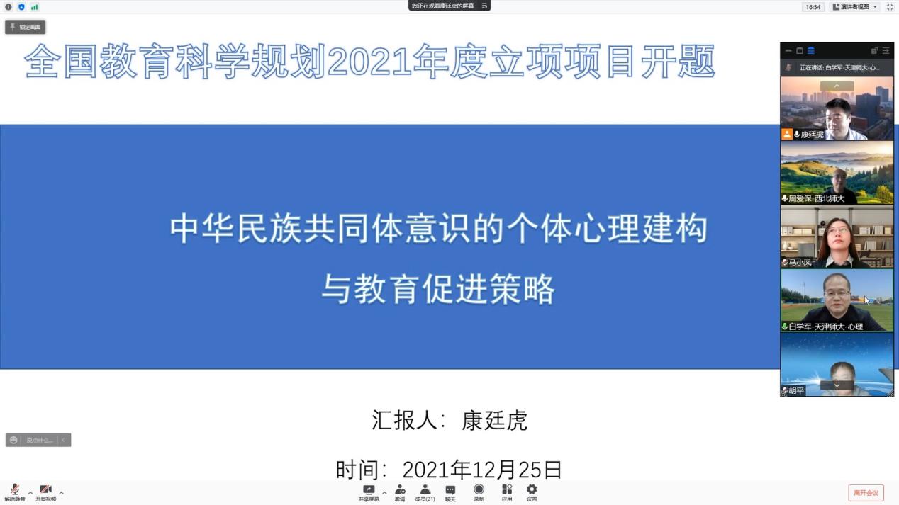 2021年12月25日下午,全国教育科学“十四五”规划2021年度课题“中华民族共同体意识的个体心理建构与教育促进策略”开题论证会在西北师范大学举行。