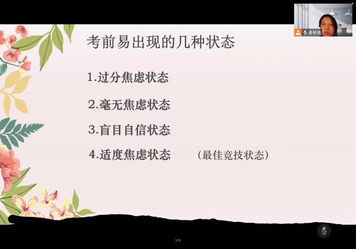 讲座上,姜艳斐老师向教师和家长解释了学生考试前后易出现的四种心理状态以及考前焦虑的几种经典类型,她特别讲到:孩子保持适度焦虑和紧张感是最佳的竞技状态。期间,姜艳斐老师从亲子关系、亲子冲突、亲子冲突管理策略三部分展开讲解,有针对性地对家庭教育中常见的问题提出了建议和解决办法。随后,姜老师从生理反应和心理反应两方面来帮助家长有效识别孩子心理危机信号,并强调,正确认识心理问题和心理疾病是帮助孩子的第一步。