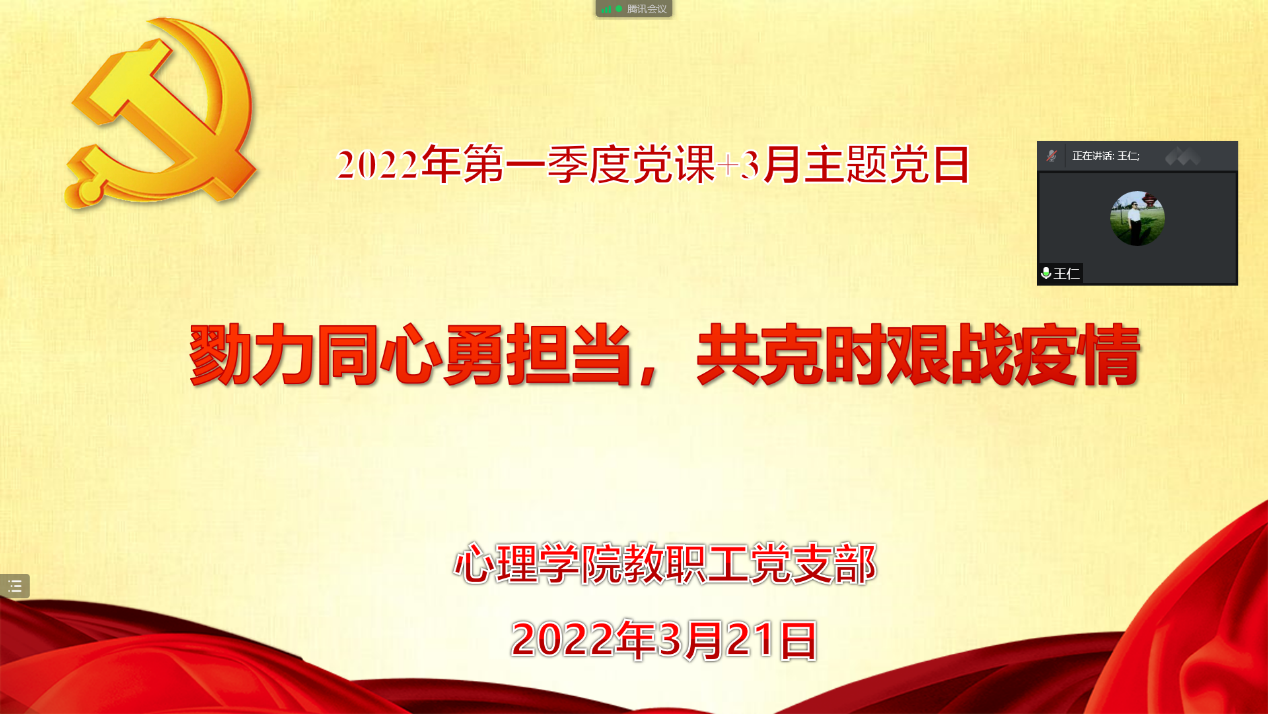 为深入领会党中央、省委和学校的决策部署精神,3月22日晚,西北师大新利体育教工党支部召开了疫情防控工作专题党课,会议由支部书记李世峰副教授主持,新利体育党委书记王仁同志给全体党员做了题为“勠力同心勇担当,共克时艰战疫情”的党课。王书记通过对习近平总书记在中共中央政治局常务委员会会议中关于疫情防控的讲话精神、甘肃省委书记尹弘在兰州市调研指导疫情防控工作中的讲话精神、以及学校关于疫情防控的最新精神的解读,分析了当前疫情防控面临的严峻形势,并强调全体党员要提高认识,在疫情面前显党性,积极响应和落实中央、省委和学校有关疫情防控的各项部署要求,全力做好疫情防控各项工作。通过学习,全体党员进一步认识到当前疫情防控工作任务的艰巨性和重要性,以及作为一名党员在疫情防控中的使命和担当。