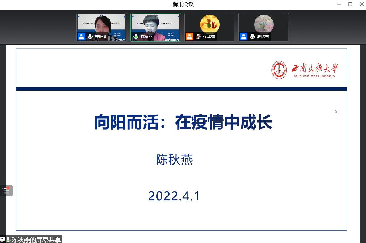 为了增加我校学生对新冠肺炎疫情防控期间心理应激反应的认识,纾解同学们的心理压力,新利体育于2022年4月1日特邀西南民族大学陈秋燕教授为我校师生作题为《疫情期间学生应激反应与有效应对方式》的专题讲座。本次讲座由新利体育心理咨询应用研究中心主任姜艳斐老师主持,110余名师生参加了本次讲座。