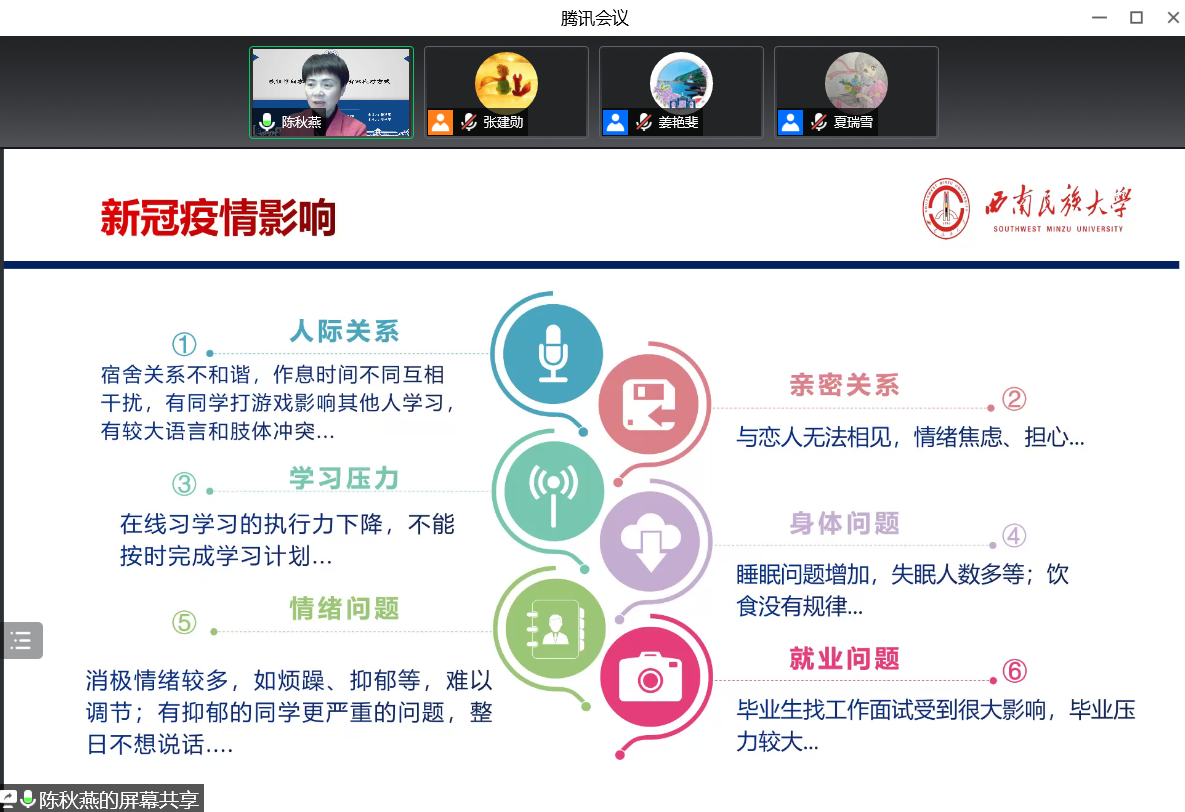 为了增加我校学生对新冠肺炎疫情防控期间心理应激反应的认识,纾解同学们的心理压力,新利体育于2022年4月1日特邀西南民族大学陈秋燕教授为我校师生作题为《疫情期间学生应激反应与有效应对方式》的专题讲座。本次讲座由新利体育心理咨询应用研究中心主任姜艳斐老师主持,110余名师生参加了本次讲座。