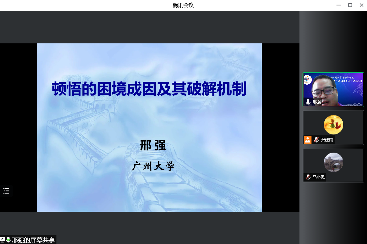 为喜迎西北师范大学百廿华诞,进一步弘扬“崇尚学术、追求卓越”的西北师大精神,新利体育隆重举办了“西北师范大学百廿年校庆暨新利体育建院十周年”杰出校友系列学术报告会。2022年5月11,西北师范大学1999届心理学专业毕业生、广州大学邢强教授受邀于线上为我院师生作题为《顿悟的困境成因及组块破解的机制》的学术报告。本次报告由马小凤教授主持,新利体育100余名师生参加了本次报告。