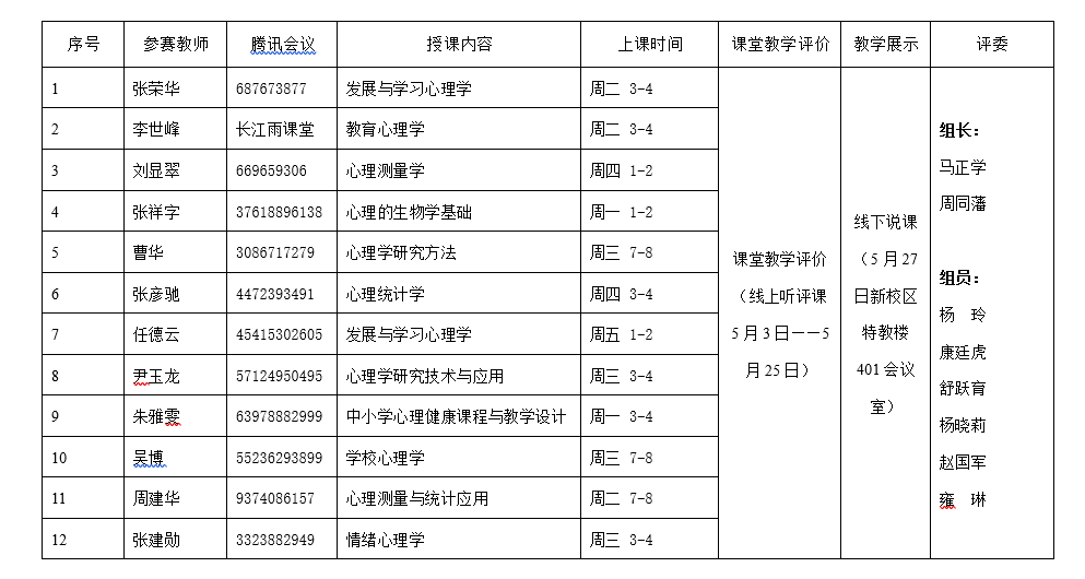 线上课堂教学展示从2022年5月16日至25日,为期两周时间。学院12位青年教师首先提交线上教学平台登录账号,并以线下课堂教学结合线上直播的方式展示了课堂教学,观摩课程包括《教育心理学》、《心理的生物学基础》、《心理学研究方法》、《心理统计学》等12门课程(具体活动安排如表1所示)。