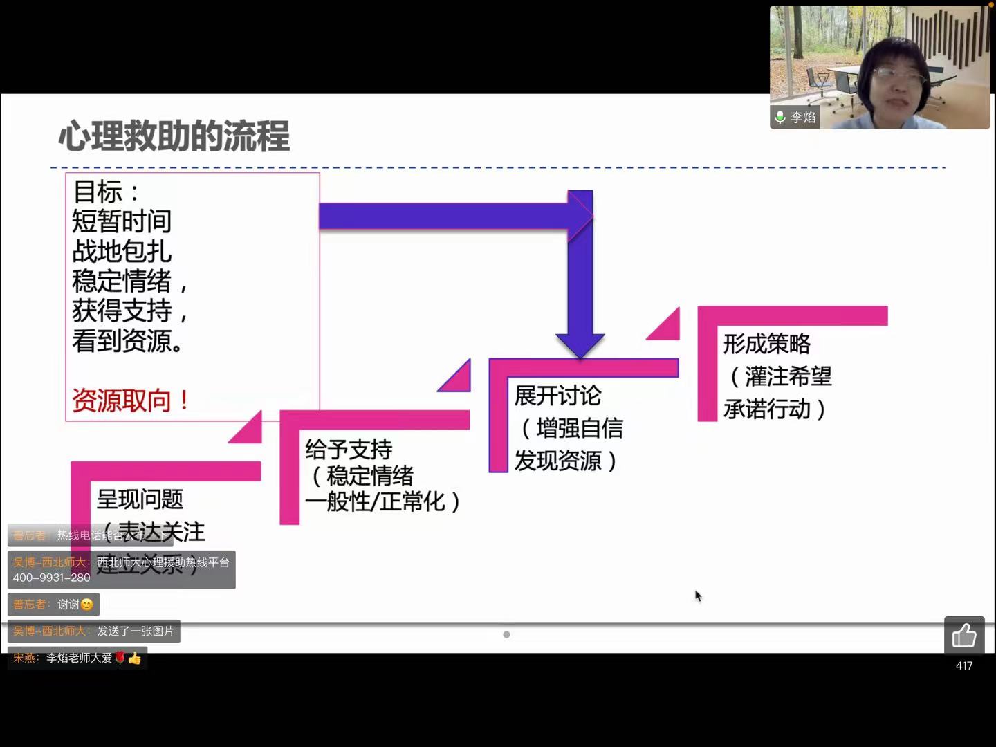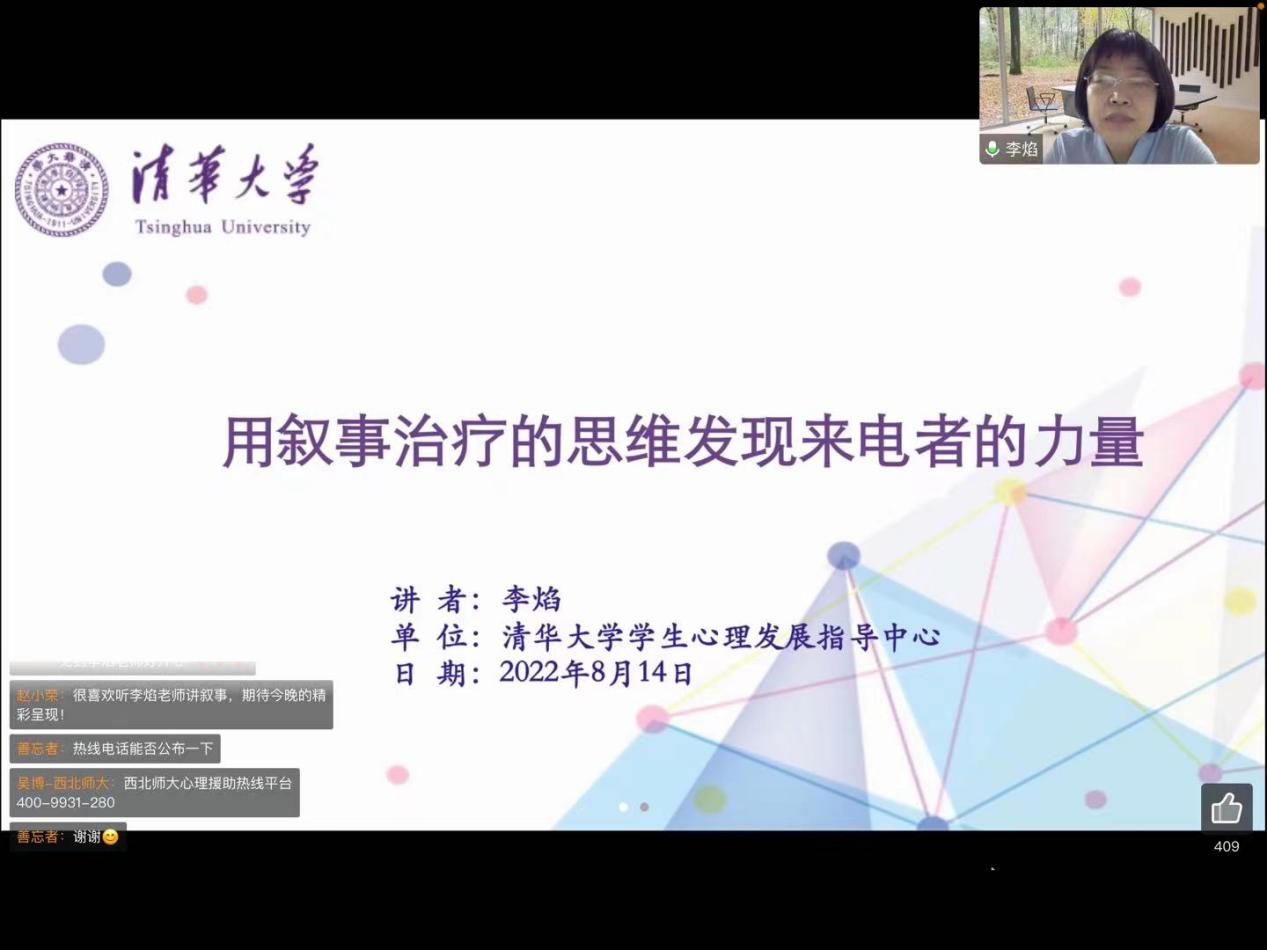 李焰教授主要为我们介绍了如何用叙事治疗的视野给予来电者力量,简单来说就是去寻找来电者的积极心理资源。李老师通过视频举例的方式引入了叙事治疗资源取向的基本理念,主要是教会我们在接线过程中去发现可以让来电者增强自信的资源,将过去的经验运用到处理当下的事情上。随后通过举例生动的为我们讲述了如何对来电者进行积极的心理辅导,心理资源是具有弹性的,咨询师在接线过程中去寻找来电者积极正向的经验,短时间内赋予来电者正能量,与来电者共同构建一个新的支线故事。