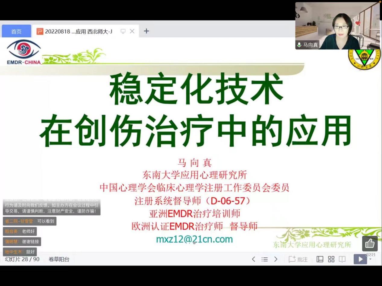 2022年8月18日,西北师范大学心理援助热线平台通过线上形式对本次热线服务的心理志愿者进行了第八场心理援助热线培训。培训由本热线平台总协调,总督导吴博副教授主持,特别邀请了东南大学应用心理研究所所长、教育部普通高等学校学生心理健康教育专家指导委员会委员、中国心理学会首批注册心理督导师、EMDR创伤心理治疗学组副组长马向真教授主讲,300多名志愿者参加了此次培训。