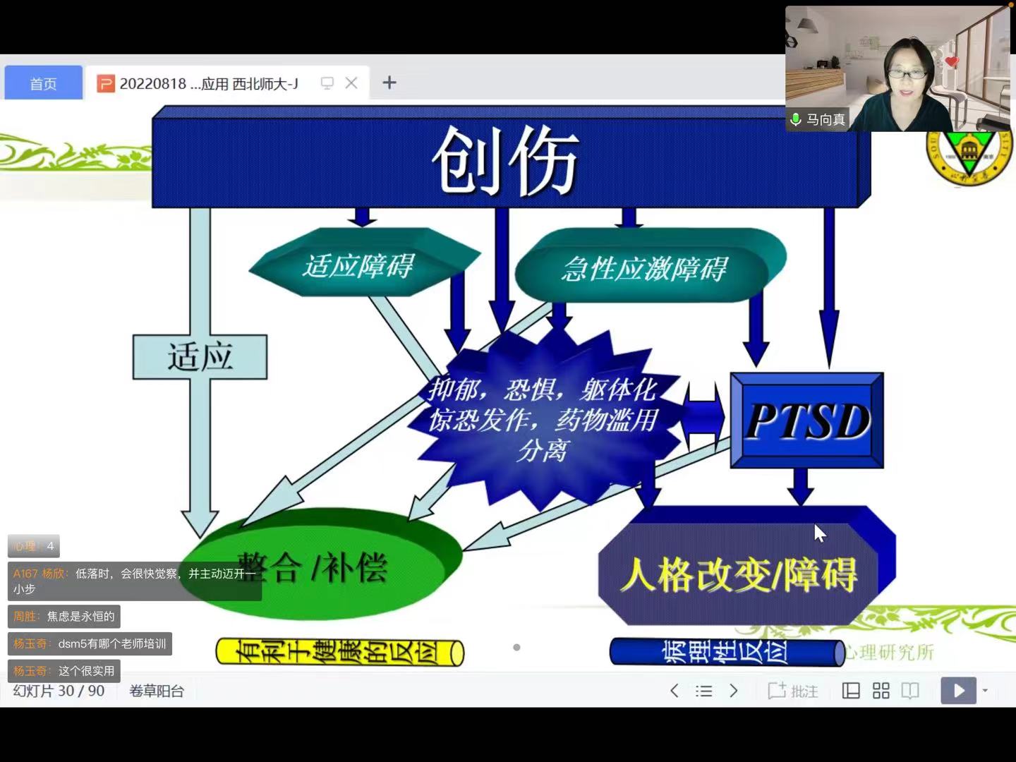 马老师首先介绍了心理创伤的概念、分类、形成以及会给来电者带来哪些影响等内容。而后,马老师从稳定化的重要性入手,着重讲解了如何进行稳定化干预。即首先要有积极稳定的治疗关系,能够进行正向的心理教育和认知干预,而后再进行创伤暴露,从而进行创伤工作。马老师特别强调了稳定化在治疗过程中的作用。稳定化可以扩大来电者的耐受窗,为治疗创伤创造非常好的条件。稳定化是热线中常用的技术,创伤后的应激反应又是热线的常见情况,稳定化的及时干预更是热线的价值所在。