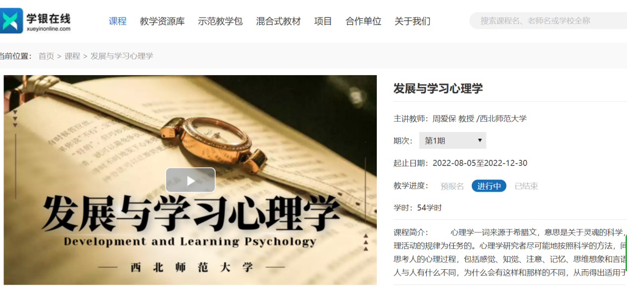 在学校的支持下,学院建设的《发展与学习心理学》线上课程于2022年9月在学银在线正式上线运行。该课程主要包括生命的发展历程、婴幼儿时期的心理发展、幼儿期的心理发展与学习、青春期的心理发展、青年初期的心理发展和大学生的心理发展共6章内容,56个视频,视频的时长平均为10分钟。