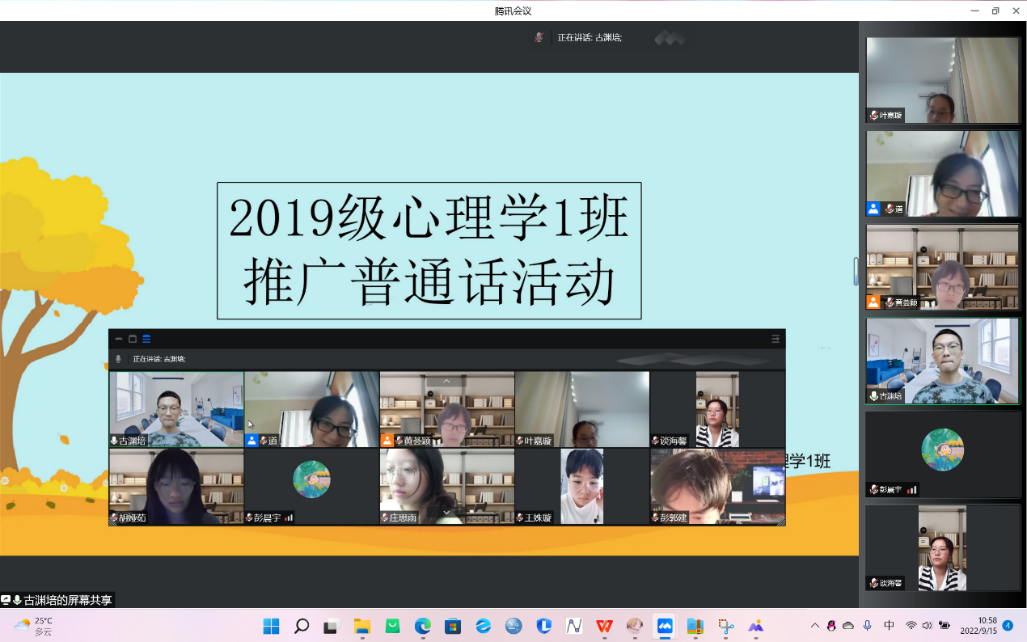 在学院组织的普通话推广展示活动中,各个班级的班主任积极动员,组织同学们通过朗诵、绕口令、配音等活动,学习和推广普通话,培养语言表达能力。此外,为了更好地宣传和推广普通话,也为了提高学院师范类本科生的朗诵技能,学院在班级活动的基础上,举行了普通话朗诵的院级比赛活动。活动要求每个班级推举优秀同学参加学院的比赛。各个班级同学积极组织和参与诵读比赛活动,经过审核评选,有11名同学向学院提交了录制的普通话诵读视频。