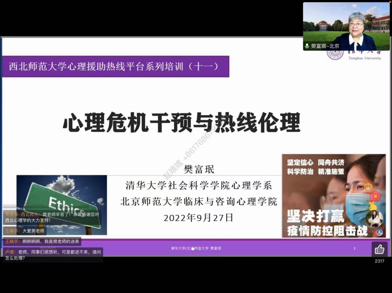 2022年9月27日,西北师范大学心理援助热线平台通过线上形式对本次热线服务的心理志愿者进行了第十一场心理援助热线培训。本次培训由本热线平台总协调,总督导吴博副教授主持,特别邀请了清华大学心理学教授、原清华大学心理学系副主任、北京师范大学心理学部临床与咨询新利体育院长、中国心理学会注册督导师樊富珉教授主讲,近500多名志愿者参加了此次培训。
