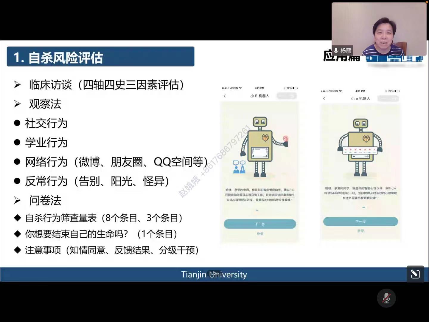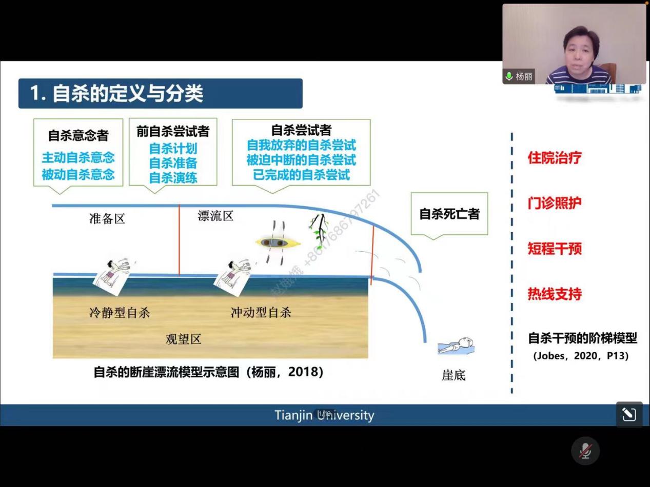 本次培训聚焦于自杀行为的风险评估。杨丽教授从什么是自杀和自杀的影响因素等内容切入,通过介绍自杀的断崖漂流模型示意图,并结合多年从事自杀干预工作的经验向志愿者们介绍自杀的定义、分类与影响因素。即自杀者可分为自杀意念者、前自杀尝试者、自杀尝试者和自杀死亡者,针对不同类型的自杀者干预方式是不同的,所以需要我们对自杀风险做出正确的评估。最后,杨老师通过临床访谈、观察法和问卷法详细为我们讲述了对来访者进行自杀评估的主要方法。