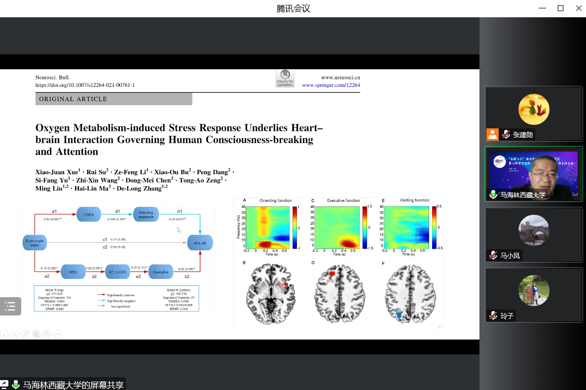马海林教授首先介绍了自己的求学经历和关注高原脑科学的缘起。其次,马海林教授跟大家分享了其课题组有关高原脑科学研究的重要发现。马海林教授早期的研究主要考察了高海拔环境下个体的执行功能、注意等认知活动。马海林教授近期的研究主要探讨了高海拔暴露影响认知功能的神经生理机制以及高海拔环境下适宜运动对个体执行功能的改善。最后,马海林教授谈到了其未来研究的规划和展望。例如,揭示高原低氧环境影响人体身心健康的内在机制,揭示高原氧干预促进身心健康的内在机制等。