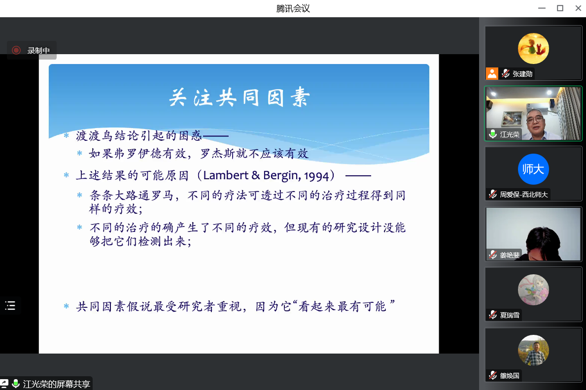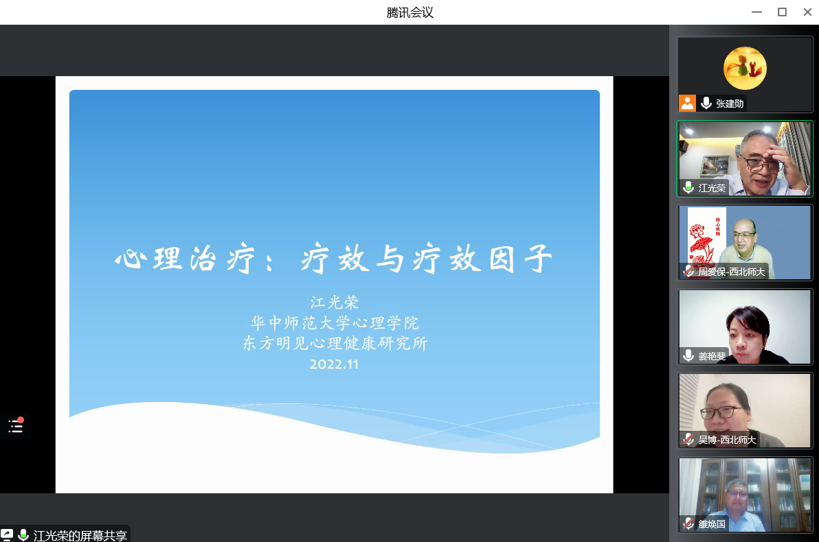 2022年10月24日,应新利体育邀请,华中师范大学江光荣教授通过线上形式为我院师生作题为《心理治疗:疗效与疗效因子》的学术报告。本次报告由新利体育周爱保教授主持,300余名师生参加了本次报告。