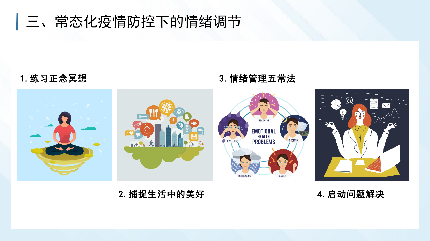 本次讲座围绕疫情期间大学生的常见心理问题调适、压力与情绪管理等问题展开。首先,朱雅雯副教授介绍了常态化疫情防控下的自我防护。面对新冠疫情的反复,朱雅雯副教授强调我们要增强常态化防控意识,坚决杜绝麻痹大意思想、要坚持戴口罩等。其次,朱雅雯副教授讲述了常态化疫情防控下的学生生活。朱雅雯副教授为大家科普了疫情期间可能会出现的认知、生理、情绪和行为方面的问题及其应对技巧。最后,朱雅雯副教授指出正念冥想、情绪管理五常法等情绪调节策略可以帮助我们缓解在常态化疫情防控下可能出现的情绪问题。