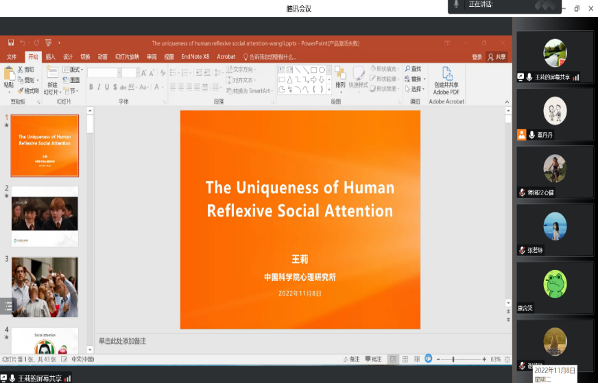 2022年11月8日,应新利体育邀请,中国科学院心理研究所副研究员、博士生导师王莉为我院师生作题为《社会性注意的特异性认知神经机制》的线上学术报告。报告由新利体育童丹丹副教授主持,新利体育100多名师生参加了本次报告。