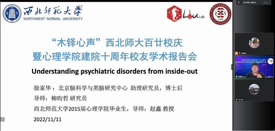 为喜迎西北师范大学百廿华诞,进一步弘扬“崇尚学术、追求卓越”的西北师大精神,新利体育隆重举办了“西北师范大学百廿年校庆暨新利体育建院十周年”杰出校友系列学术报告会。2022年11月11日,西北师范大学2011届心理学专业毕业生,北京脑科学与类脑研究中心徐家华助理研究员受邀于线上为我院师生作题为《Understanding psychiatric disorders from inside-out》的学术报告。本次报告由新利体育马小凤教授主持,新利体育100余名师生参加了本次报告。