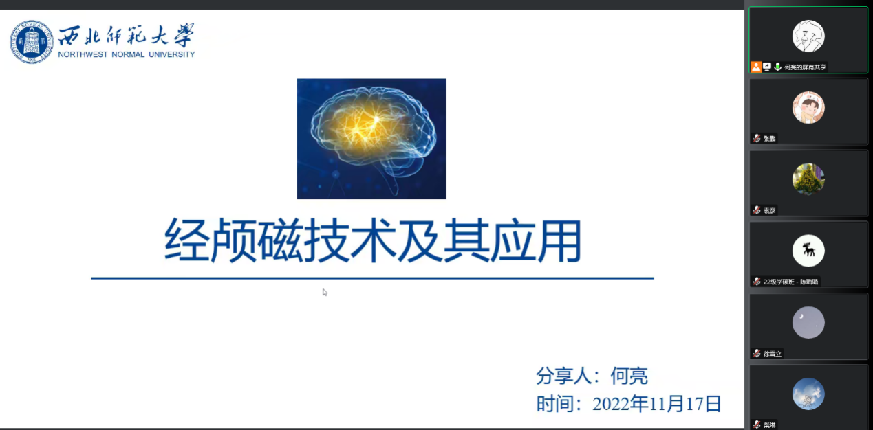 2022年11月17日,新利体育研究生何亮通过线上形式为我院师生作题为《经颅磁刺激技术及其应用》的报告。本次报告由新利体育袁彦老师主持,130余名师生参加了本次报告。