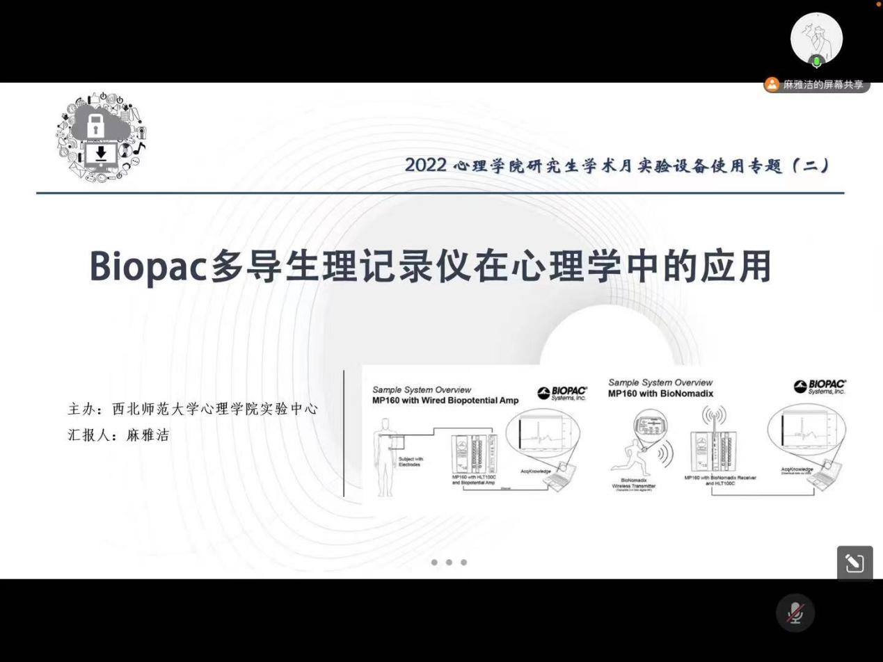 麻雅洁同学围绕多导生理记录仪的概念、工作原理、操作流程、数据分析和研究实例等方面和大家进行了交流分享。新利体育最新购进的Biopac MP160多导生理测量设备是目前国际上普遍使用,功能强大的电脑化多导生理记录仪。通过多个双通道无线发射接收器进行生理信号采集,在一定程度上反映大脑处理信号的过程和方式,因此可应用于情绪心理学、认知心理学和人因工程等领域的研究。