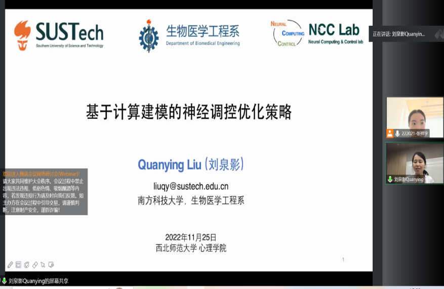 2022年11月25日,应新利体育邀请,南方科技大学刘泉影助理教授通过线上形式为我院师生作题为《基于计算建模的神经调控优化策略》的学术报告。本次报告由新利体育张祥字老师主持,新利体育100余名师生参加了报告。