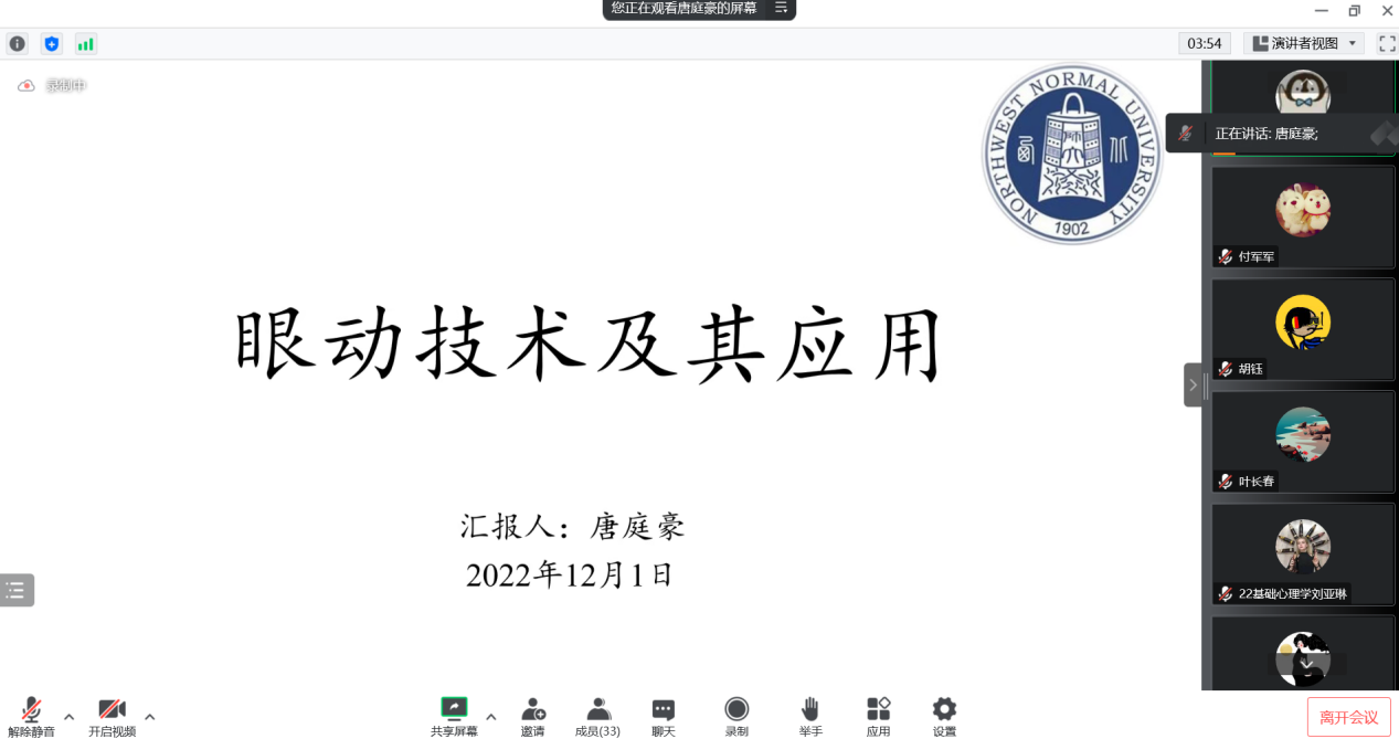 2022年12月1日下午,新利体育研究生唐庭豪通过线上形式为我院师生作题为《眼动技术与应用》的报告。本次报告由新利体育付军军老师主持,50余名师生参加了本次讲座。